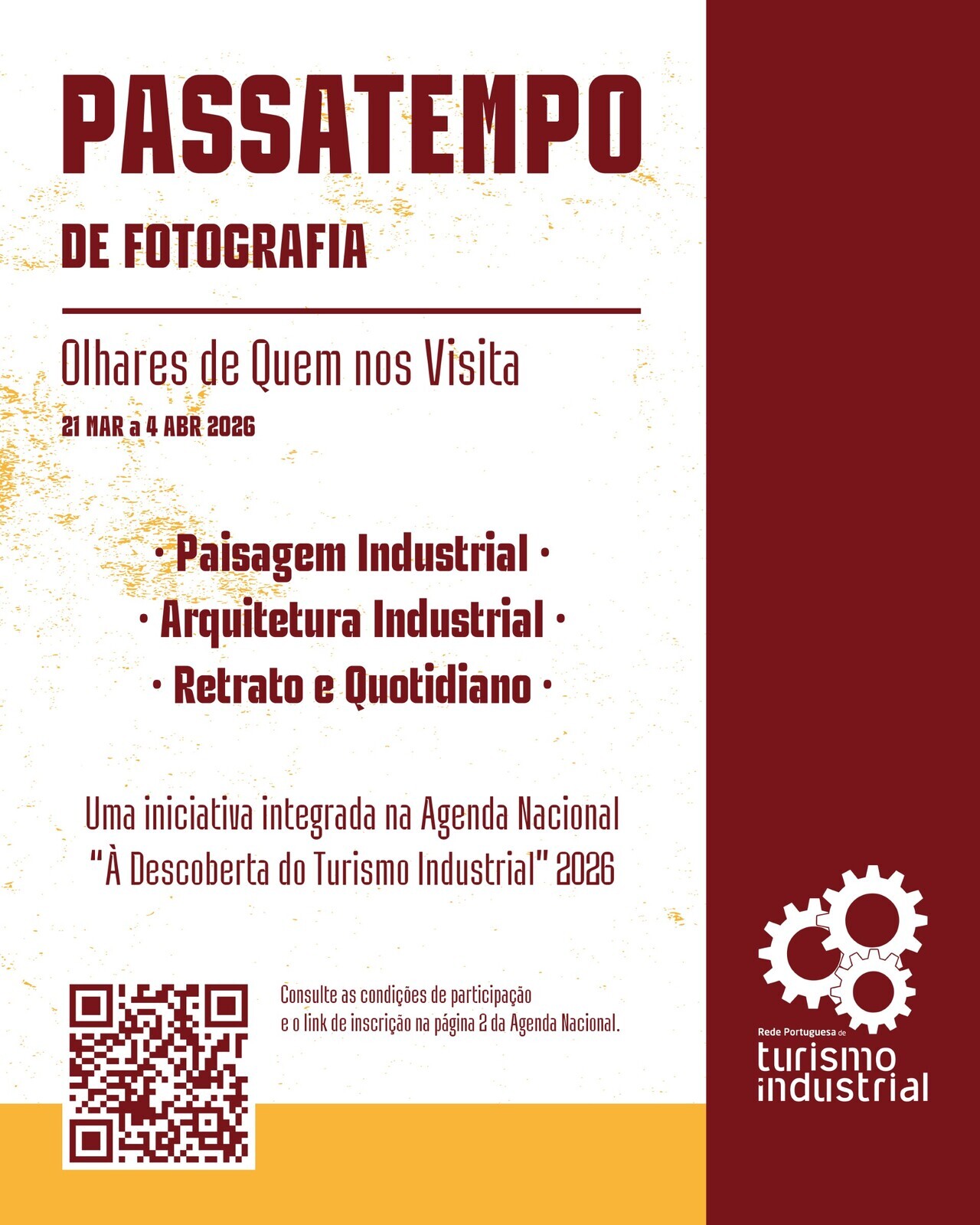 Em paralelo, decorrerá ainda o Passatempo de Fotografia, uma iniciativa que convida os participantes a captar, através da imagem, diferentes olhares sobre a Paisagem Industrial, a Arquitetura Industrial e o Retrato e Quotidiano Industrial, podendo submeter até 3 fotografias enquadradas nessas mesmas categorias.